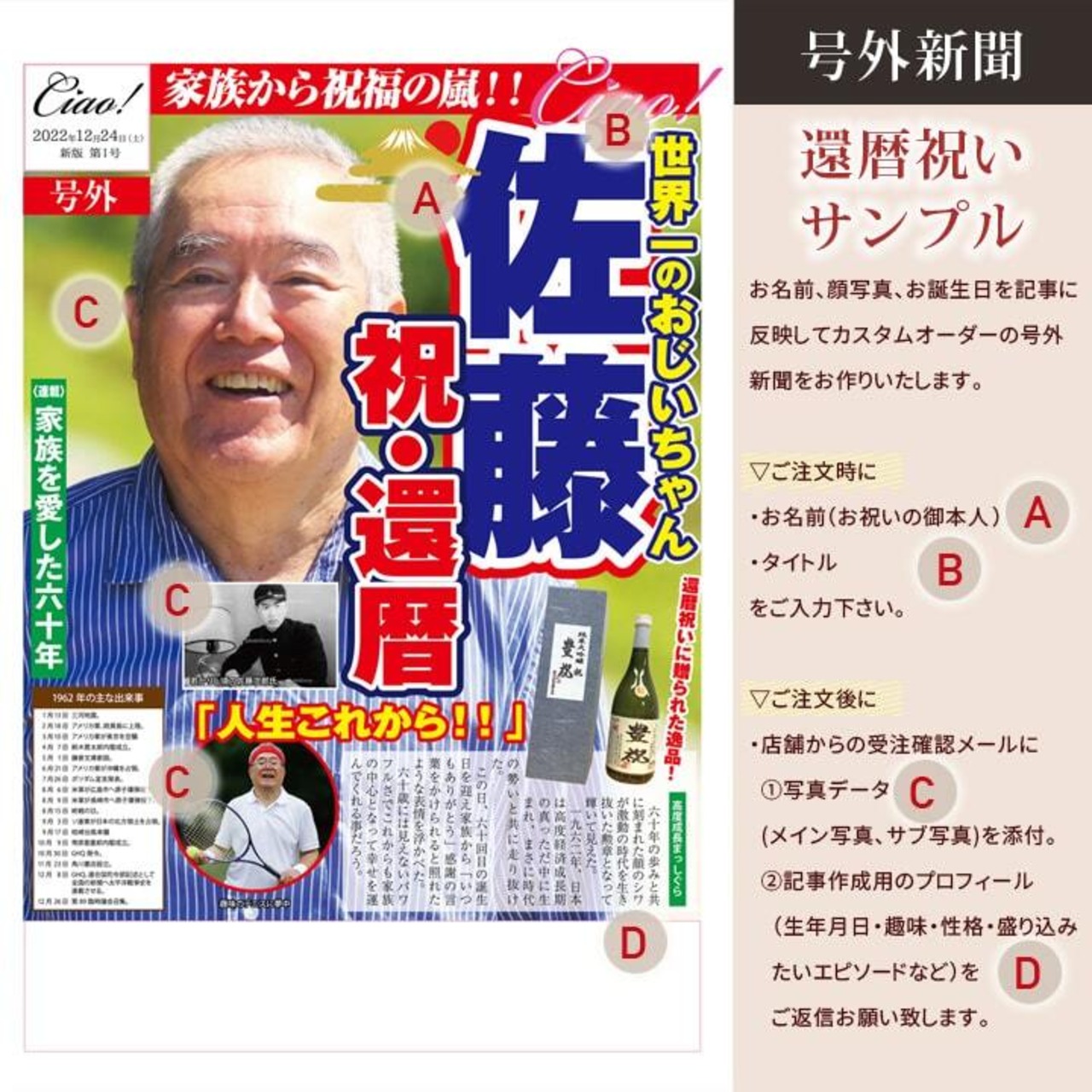 オリジナルの号外新聞は還暦・古希・喜寿のお祝いを1面トップニュースでお祝いするユーモアたっぷりな楽しくて感動させる贈り物です。思い出に残る還暦祝いに、プレゼントシーンが盛り上がります♪